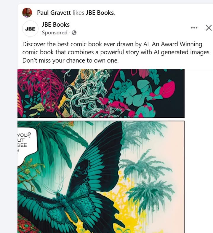 Comic creator David Lloyd has alerted us to what appears to be a scam ad circulating on Facebook using comic creator or auteur names, including writer and publisher Paul Gravett, to promote their AI-created graphic novels.