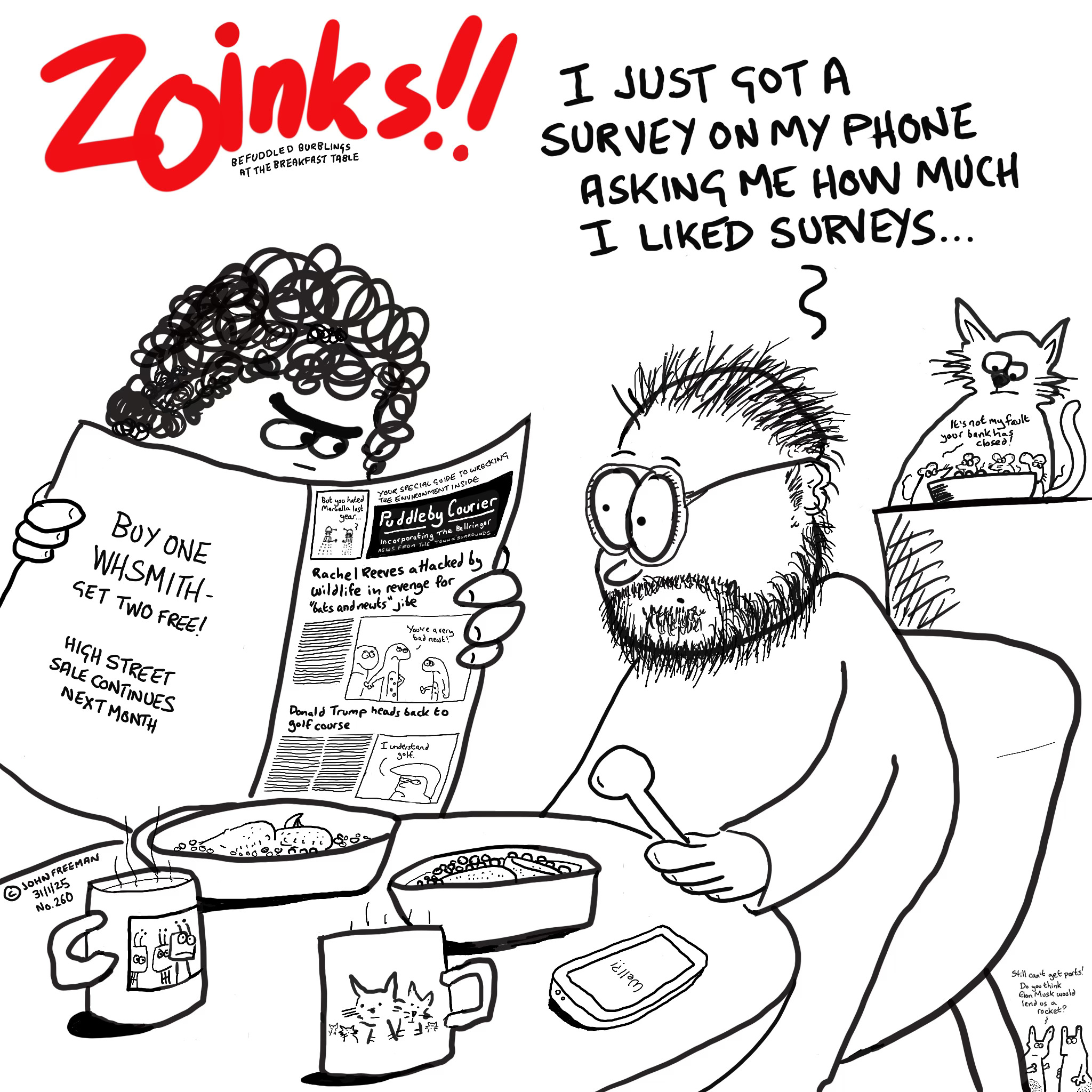 Oh, and I did promise you a badly-drawn cartoon, didn’t I? Here’s the latest “Zoiks”, a one panel strip I drew daily for several months, until RSI started impacting my drawing. Plundering from the best, David Lynch for example, much of the panel remains the same each episode, but I vary things like the newspaper headlines, cat and aliens. There’s an archive here on Flickr if you’re very, very bored…