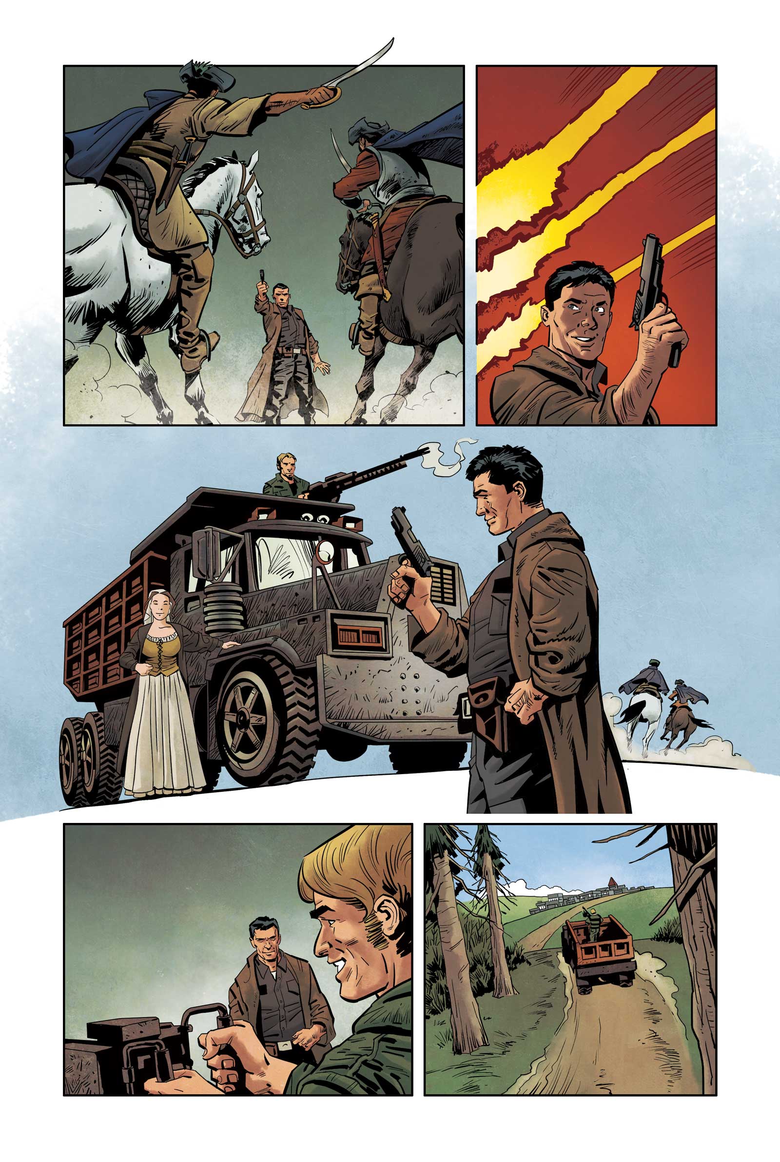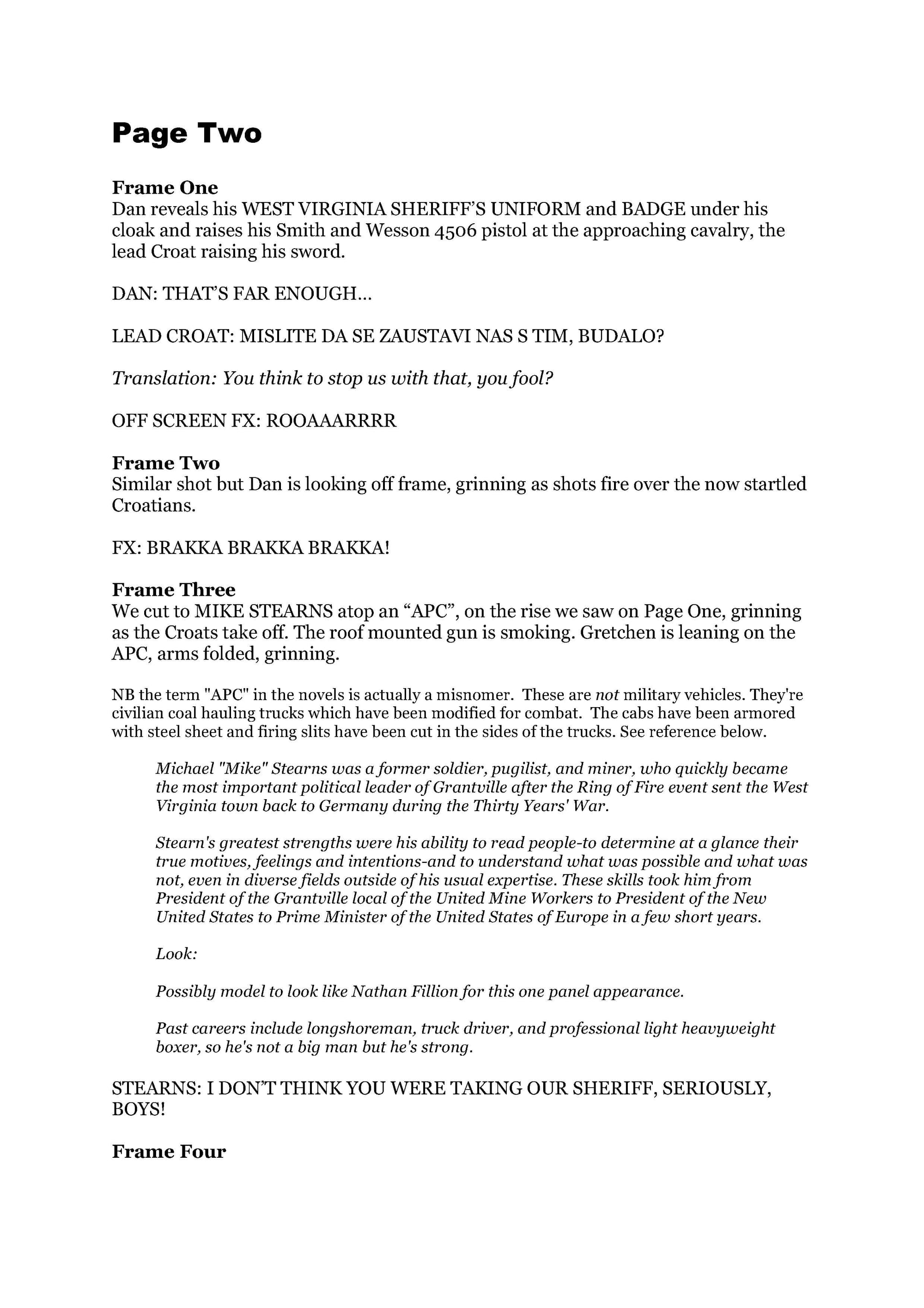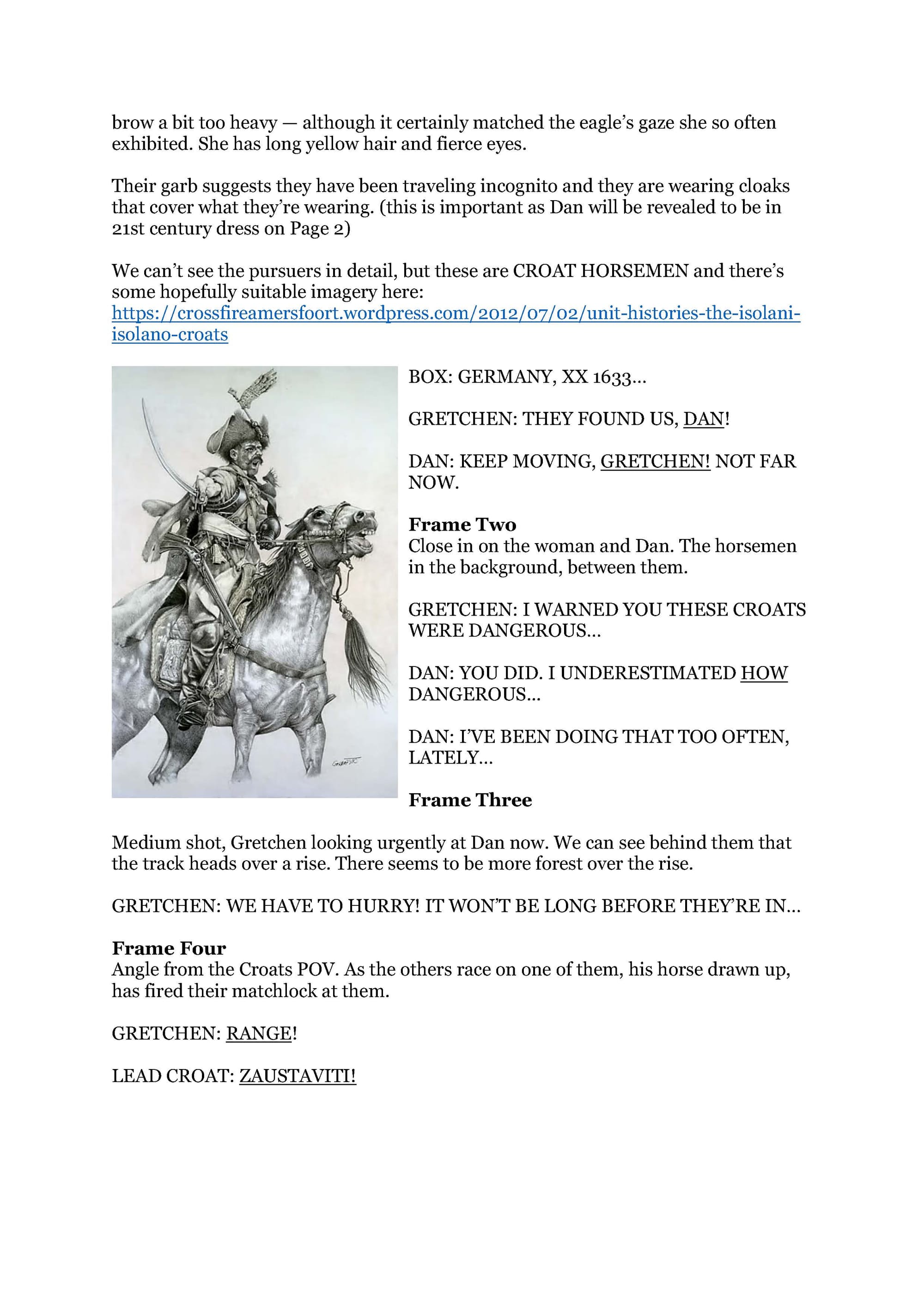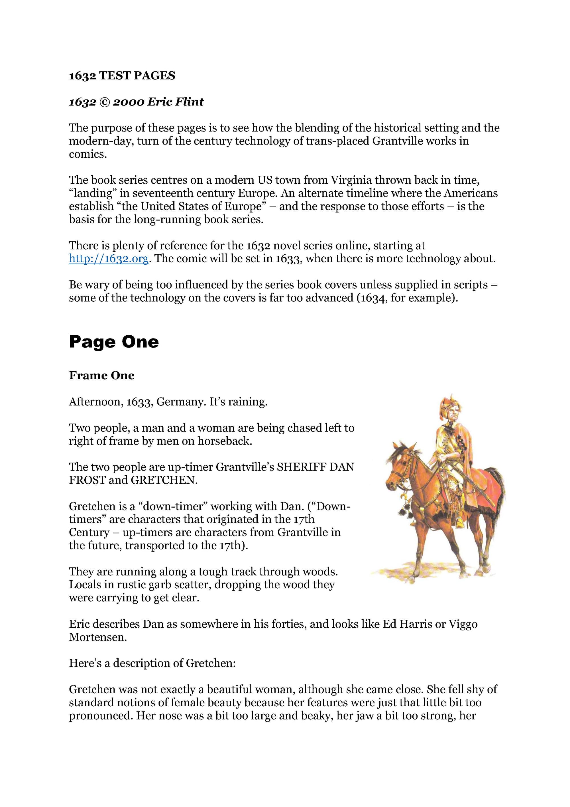 Back in 2016, Titan Comics approached Eric to explore the possibility of creating new comics based on his 1632 universe and I was on board as editor, but, unfortunately, partly due to Eric's health and workload, didn't progress beyond settling on an artist and producing a two-page test strip, written by me, pencilled and inked by Iron Man artist Kev Hopgood and coloured by Matt Soffe. So the samples that follow are very much in the "What Might Have Been" category of my work – Eric himself would have written the script for the comic, had it happened.